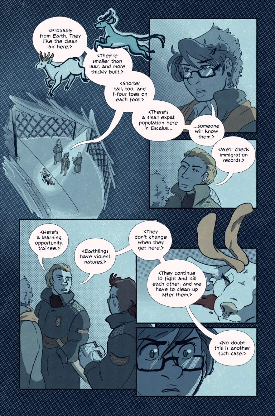 The taller of the two officers leaned away. < We'll check immigration records, > they said dismissively, and turned to the other officer. < Here's a learning opportunity, trainee. Earthlings have violent natures. They don't change when they get here. They continue to fight and kill each other, and we have to clean up after them. No doubt this is another such case. >