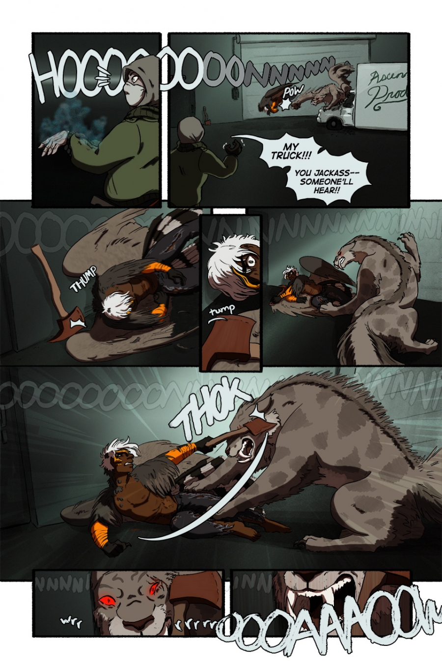 He fumbled for it, pulling his wing out from under himself, and looked up to see Kei looming over him with one huge paw lifted. As Kei slammed his paw down, hooking the claws into Hawk's thigh, Hawk twisted around to swing the axe--