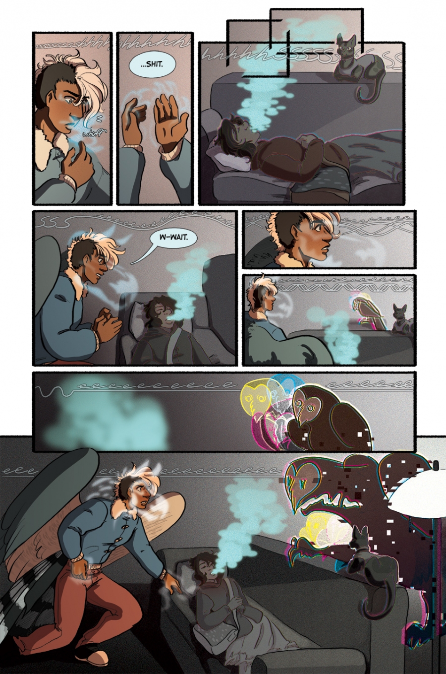 Sitting on something behind the couch was the owl, sort of. It crouched there, an arrangement of plain shapes, but pale multicolored images of it swam at its edges, as though it was off-register somehow. Bits of it sheared together as it looked back at him and moved its head around in a way that left images of itself behind. Then it came towards him, somehow, and got bigger as it came. By the time it was pulling itself up onto the back of the couch (an action that Janis seemed unaware of) it didn't look much like an owl anymore. It had stretched out its neck, which split along the bottom into a pair of crude jaws, and its body was only vaguely bird-shaped now.