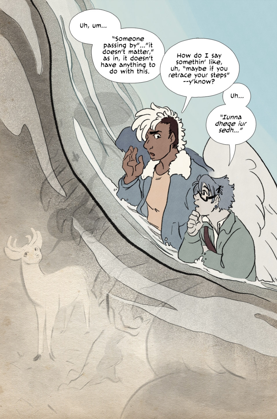 After a very long time, she said, < I was startled, that's all. > Something about a white flash, a lanyard strung with objects in midair. She continued thoughtfully, < ...I was at my door, and I dropped my keys, because... > The white flash was behind her, illuminating her in silhouette for just a moment. She turned and looked up into Hawk's shifting faces as though only just realizing. < There were people who startled me. >